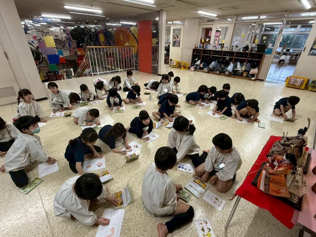 遊戯室や二階にあるおひなさまの飾りを見ながら顔や持ち物を描きました🖍