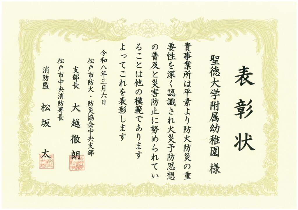 本園は松戸市防火・防災協会中央支部様ならびに松戸市中央消防署様より「令和7年度 支部長表彰」 をいただきました。