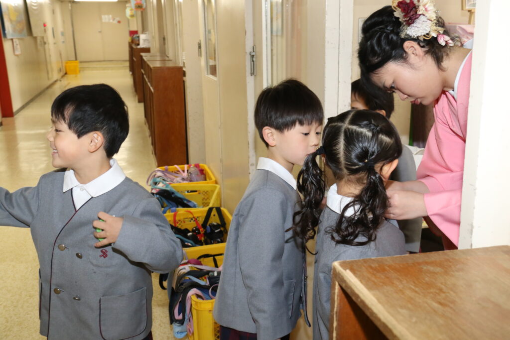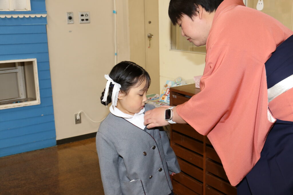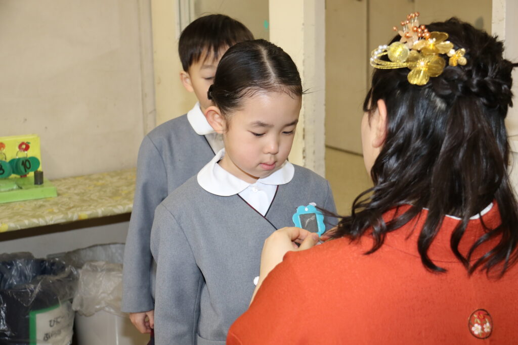 保育室では担任の先生に胸花をつけてもらいましたね。