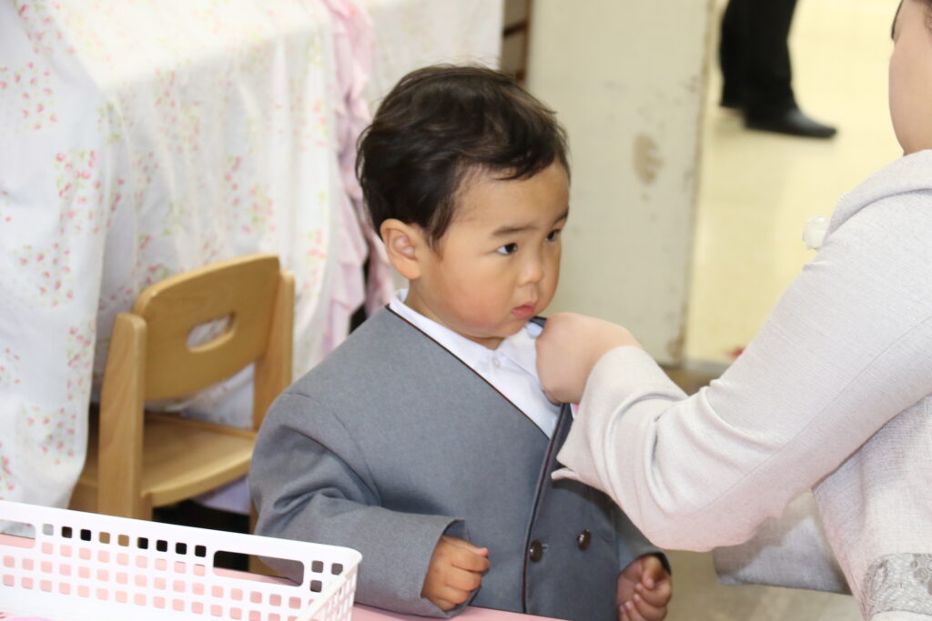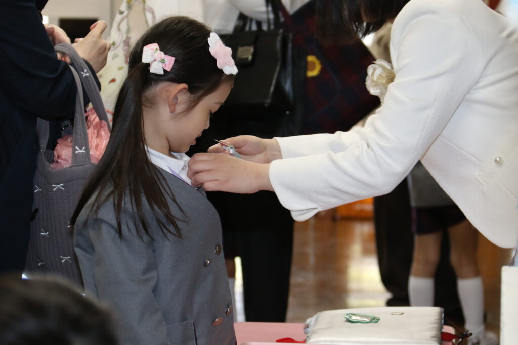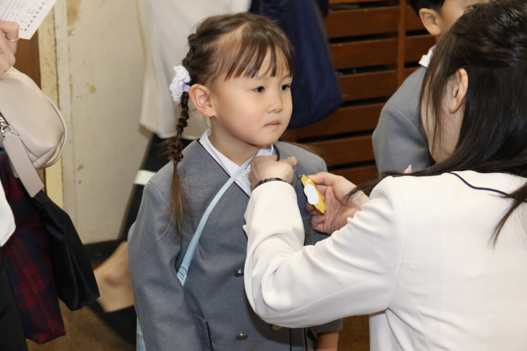 担任の先生から胸にバッジをつけてもらい、緊張と嬉しそうな笑顔が見られました。