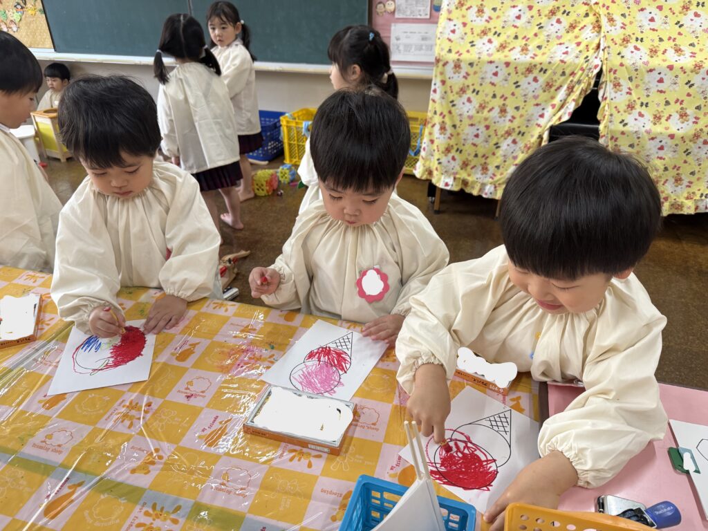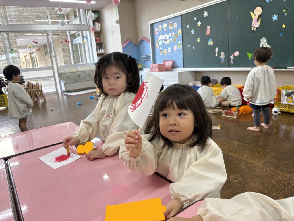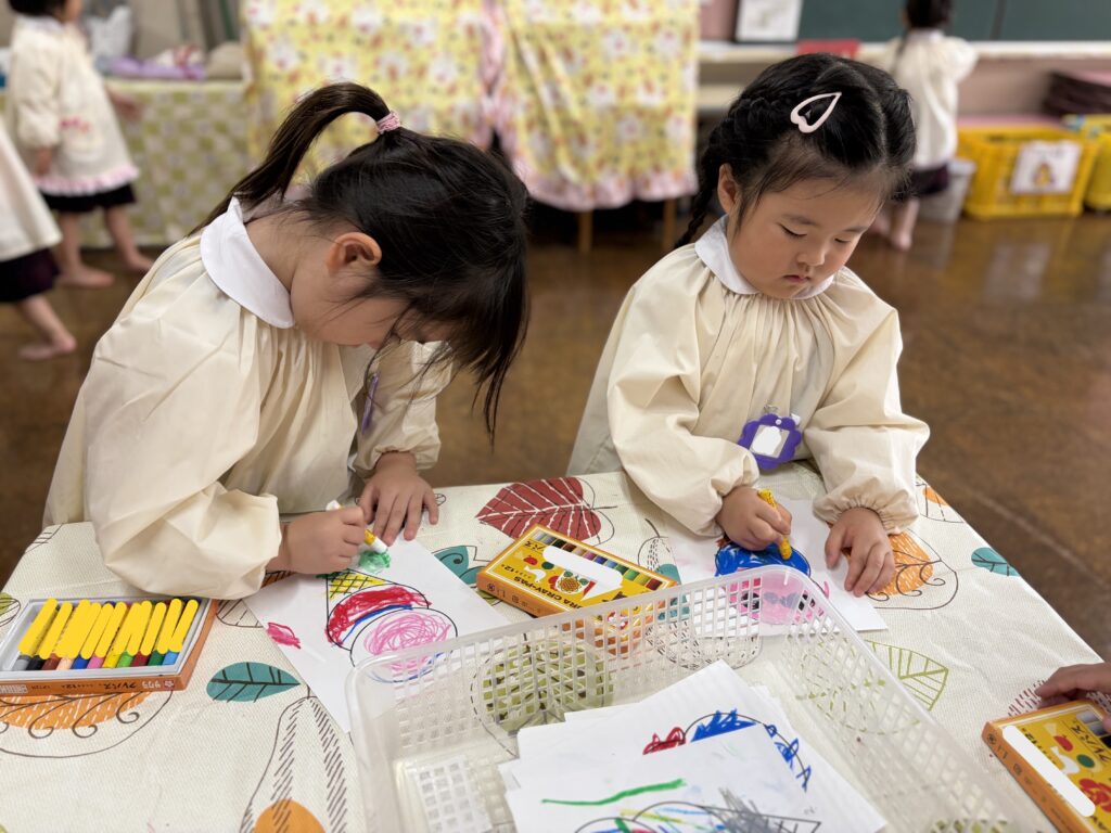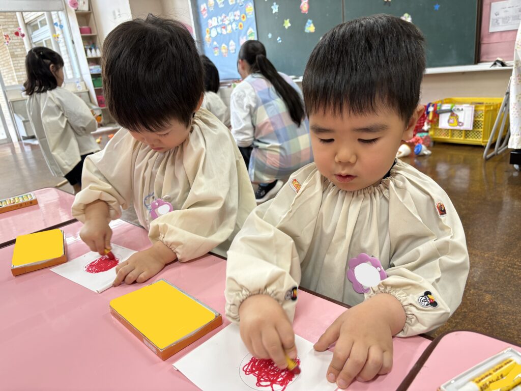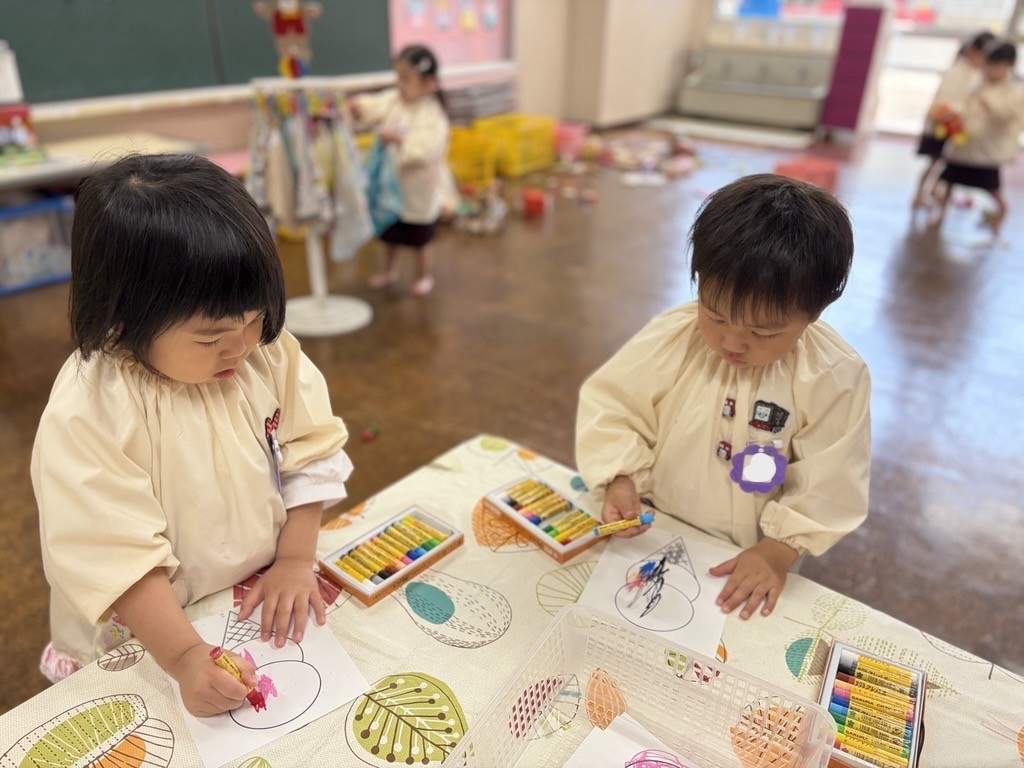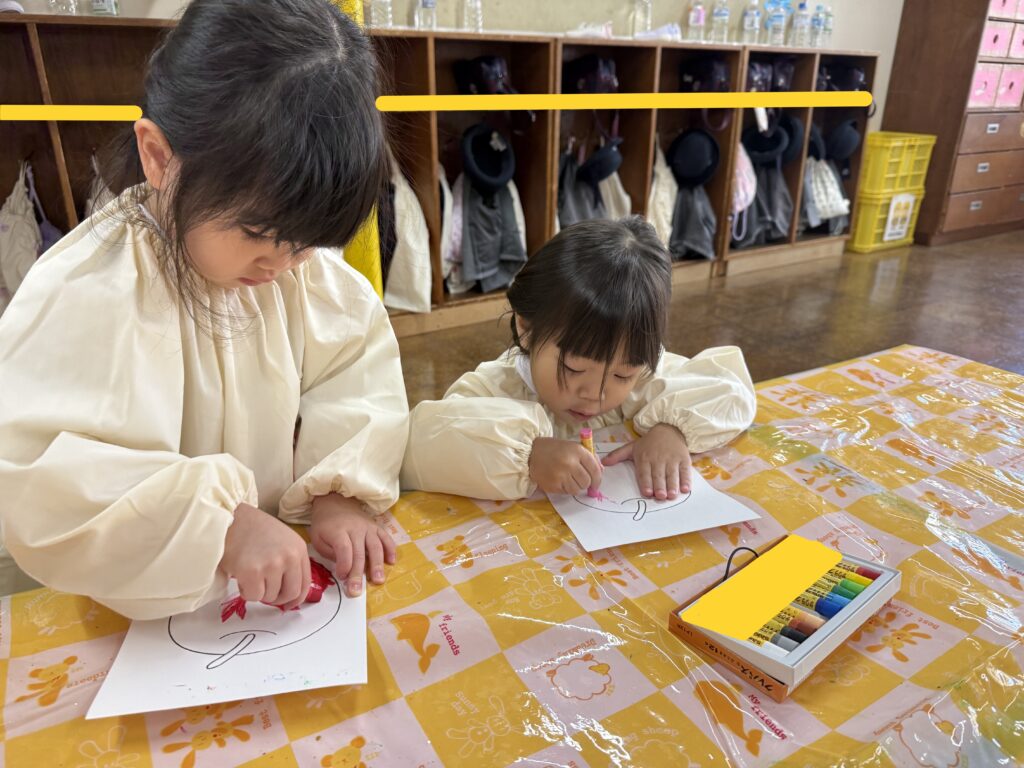 幼稚園でお支度をしたり、玩具で遊んだり、クレパスを使ってぬりえをしました🖍️