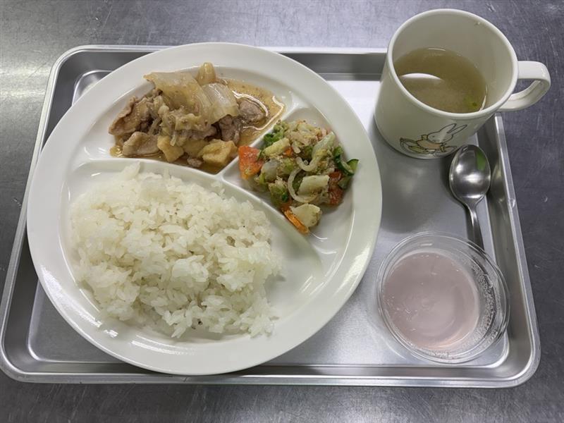4/21 ごはん 大根の味噌汁 豚肉のうま煮 蒸し鶏サラダ ピーチゼリー