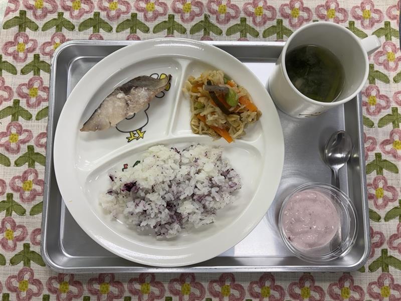 4/28 ゆかりごはん 小松菜の味噌汁 あじの塩こうじ焼き 切干大根の煮物 いちごフルーチェ