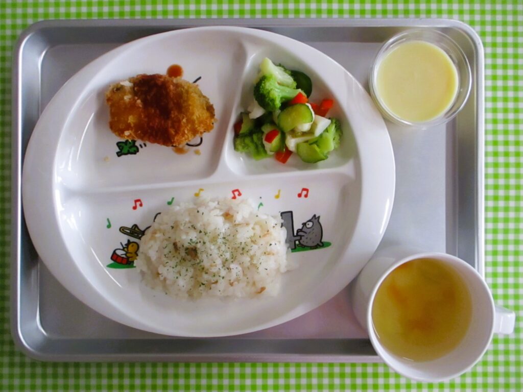 わかめごはん、大根の味噌汁、シュウマイ、野菜の和風煮、みかんヨーグルト