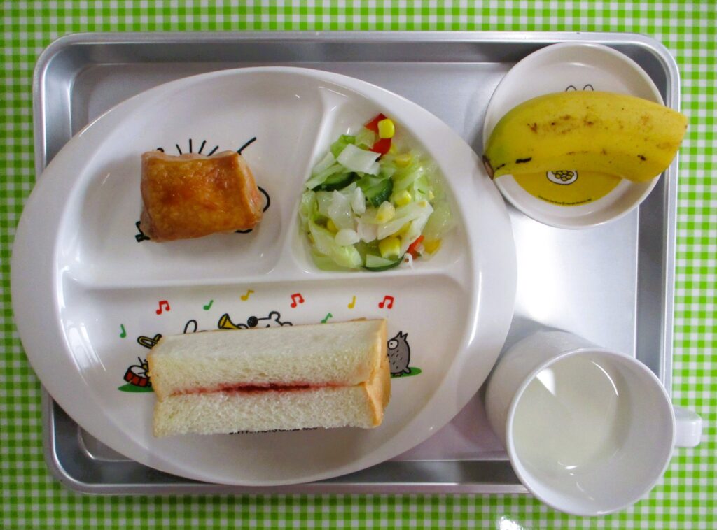 鶏肉と小松菜の和風スパゲッティ、ミルク、ミックスサラダ、バナナ