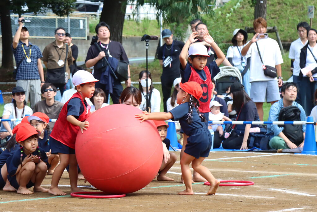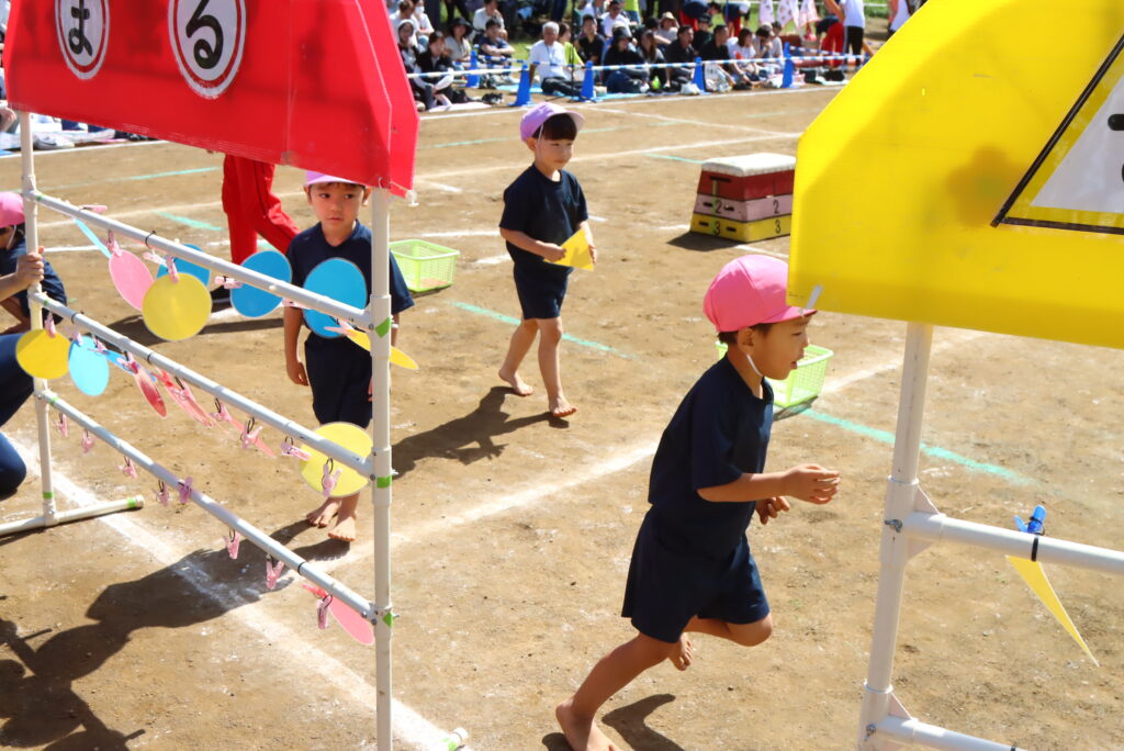 一つひとつの障害物を乗り越え、最後まで諦めずにゴールまで向かい、大玉転がし、玉入れ、鈴割りでは、友達と協力して一生懸命取り組みました。