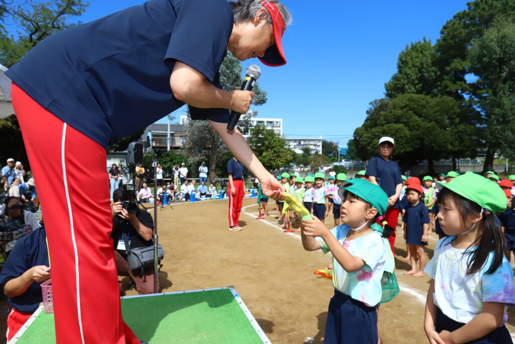 リレーに勝ったクラスが園長先生から優勝杯、全員に園長先生から参加賞をいただきました。