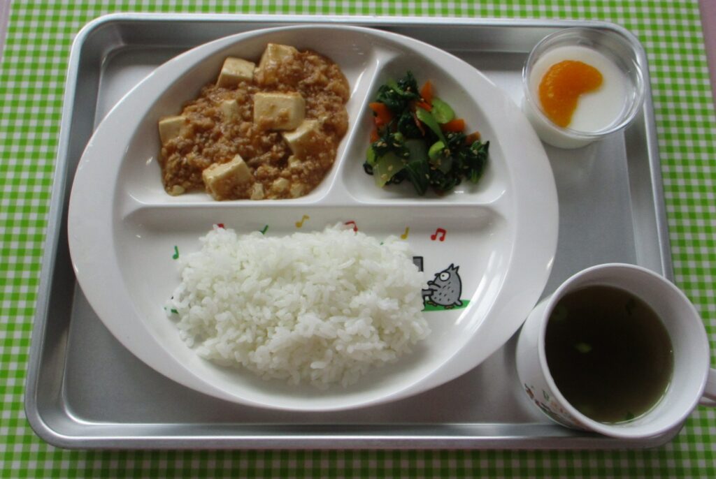 ごはん、もずくの中華スープ、麻婆豆腐、チンゲンサイの中華和え、杏仁豆腐