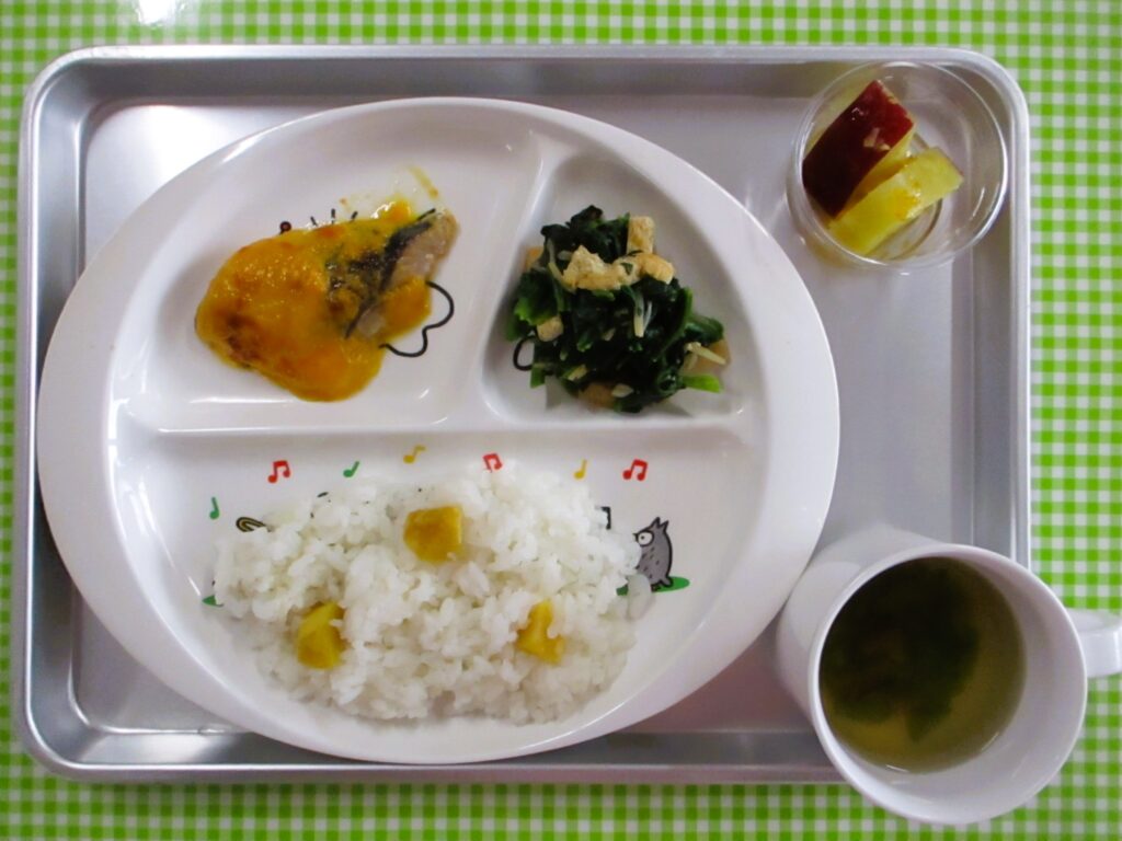 ★お月見メニュー★栗ご飯、絹さやのすまし汁、あじのもみじ焼き、ほうれん草ときのこのお浸し、さつまいものマーマレード煮