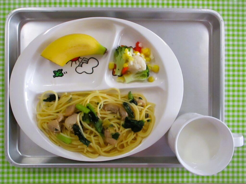 鶏肉と小松菜の和風スパゲッティ、ミルク、ミックスサラダ、バナナ