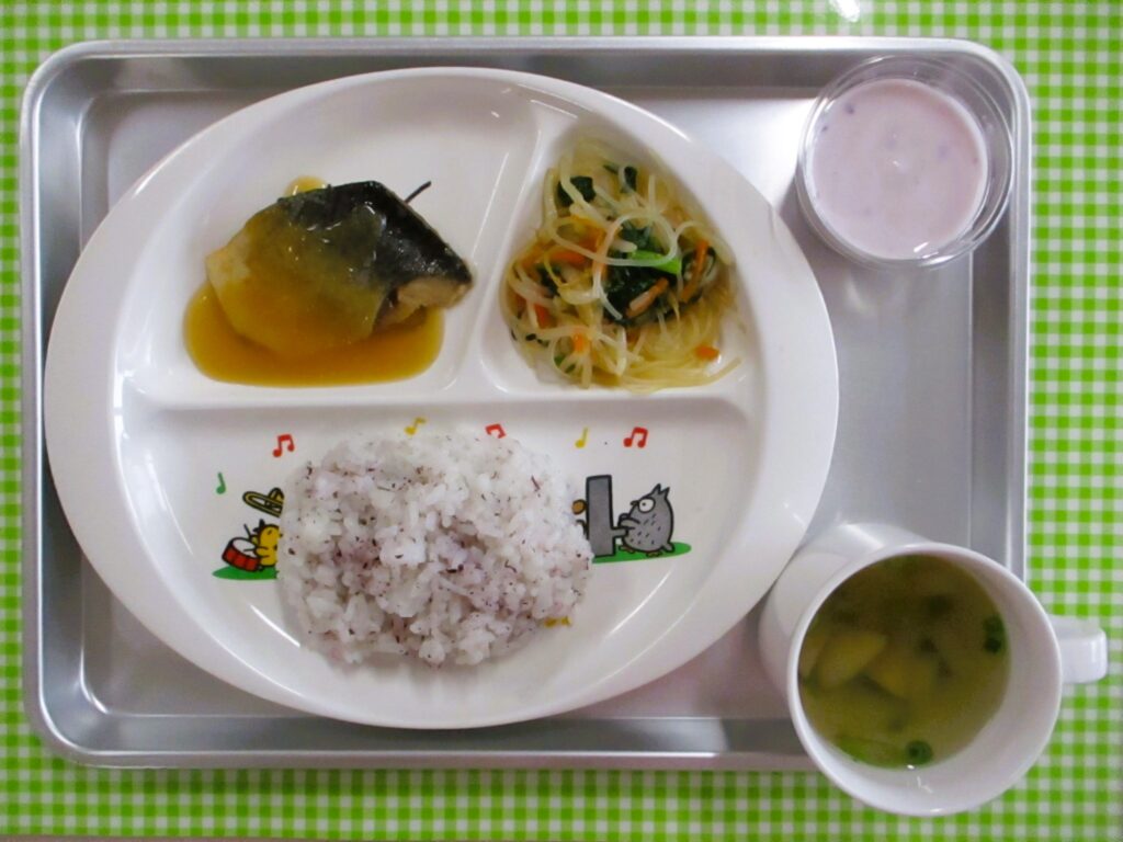 ゆかりごはん、けんちん汁、さばの味噌煮、春雨の和風サラダ、ブルーベリーヨーグルト