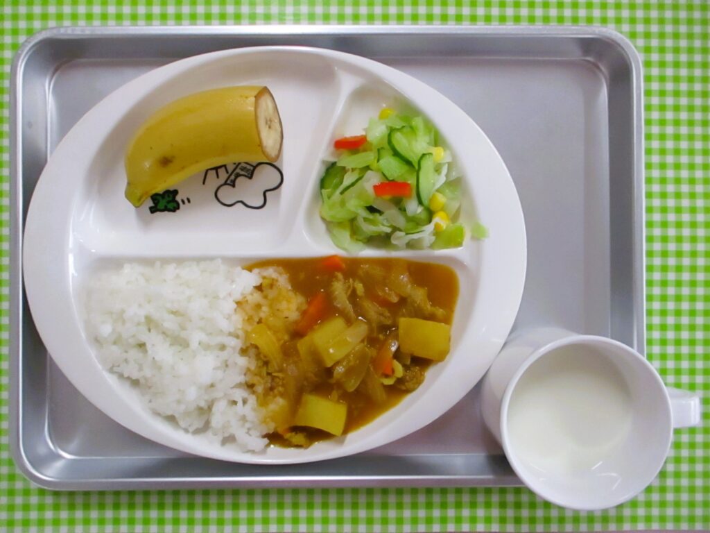 ポークカレーライス、ミルク、カラフルサラダ、バナナ