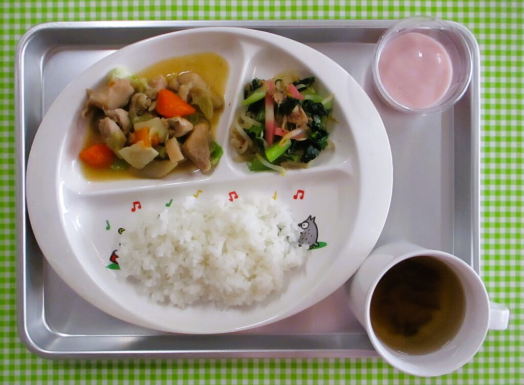 ごはん、きのこのすまし汁、鶏肉と根菜の味噌炒め、小松菜とかまぼこのおかか和え、いちごフルーチェ