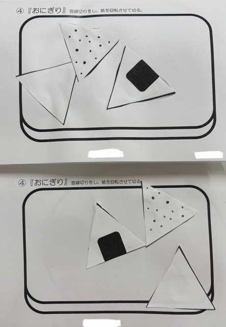 はさみで『連続切り』をします。クッキーの次は三角形の「おにぎり」に挑戦です。