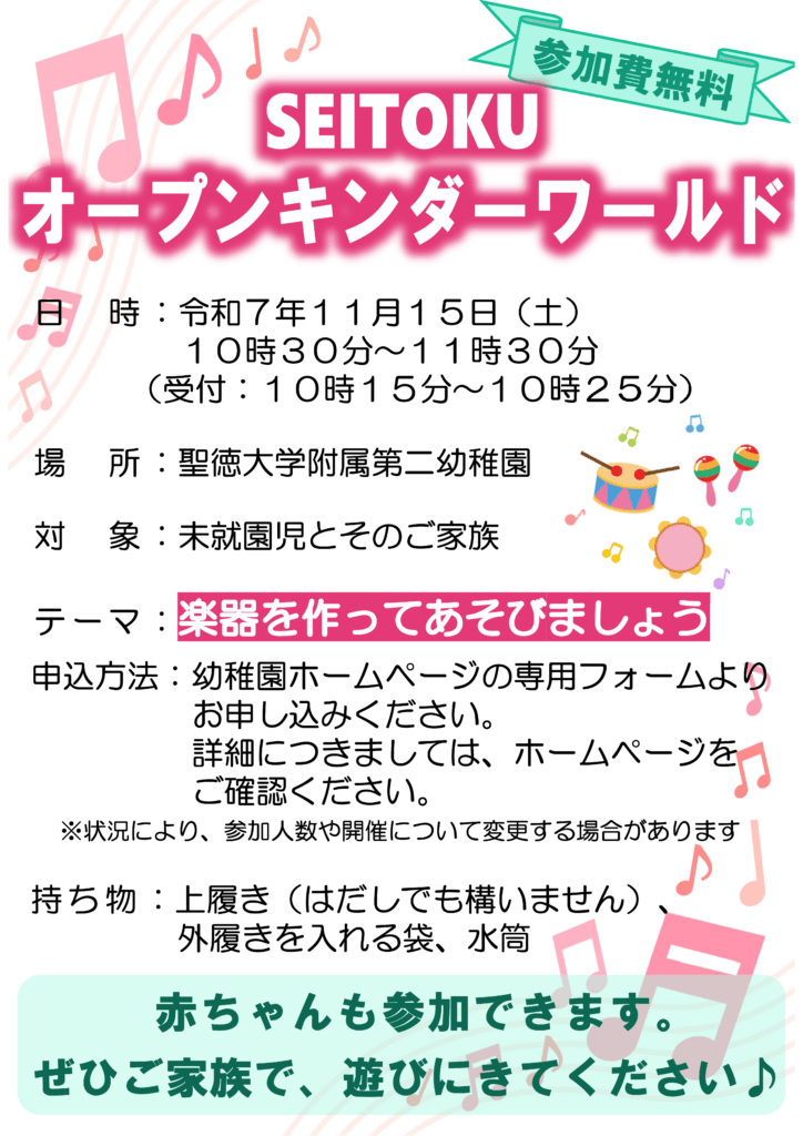 ※状況により、園庭で遊ぶ時間を設けます。お子様、保護者の方ともに運動しやすい服装でご参加ください。