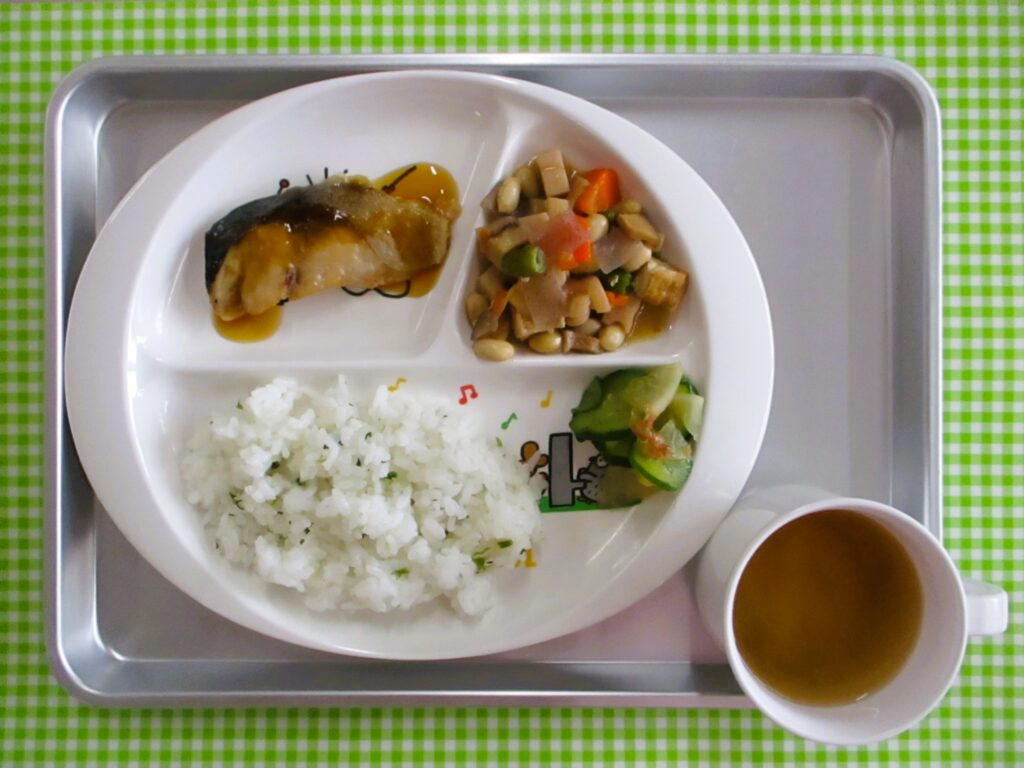 菜飯、キャベツの味噌汁、あじのかば焼き、五目煮、きゅうりの甘酢醤漬け