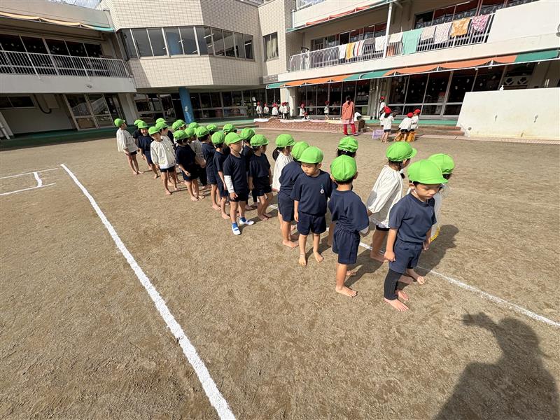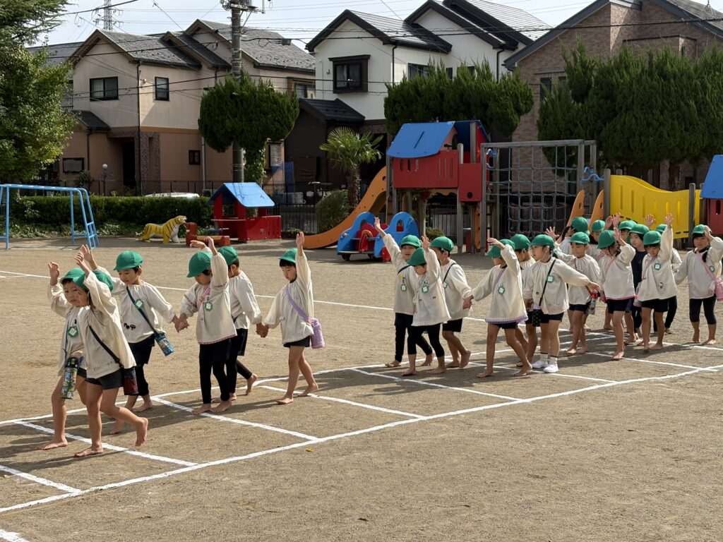 先生と交通ルールを確認した後、園庭に横断歩道などを描き、実際に手を挙げて渡りしました。
