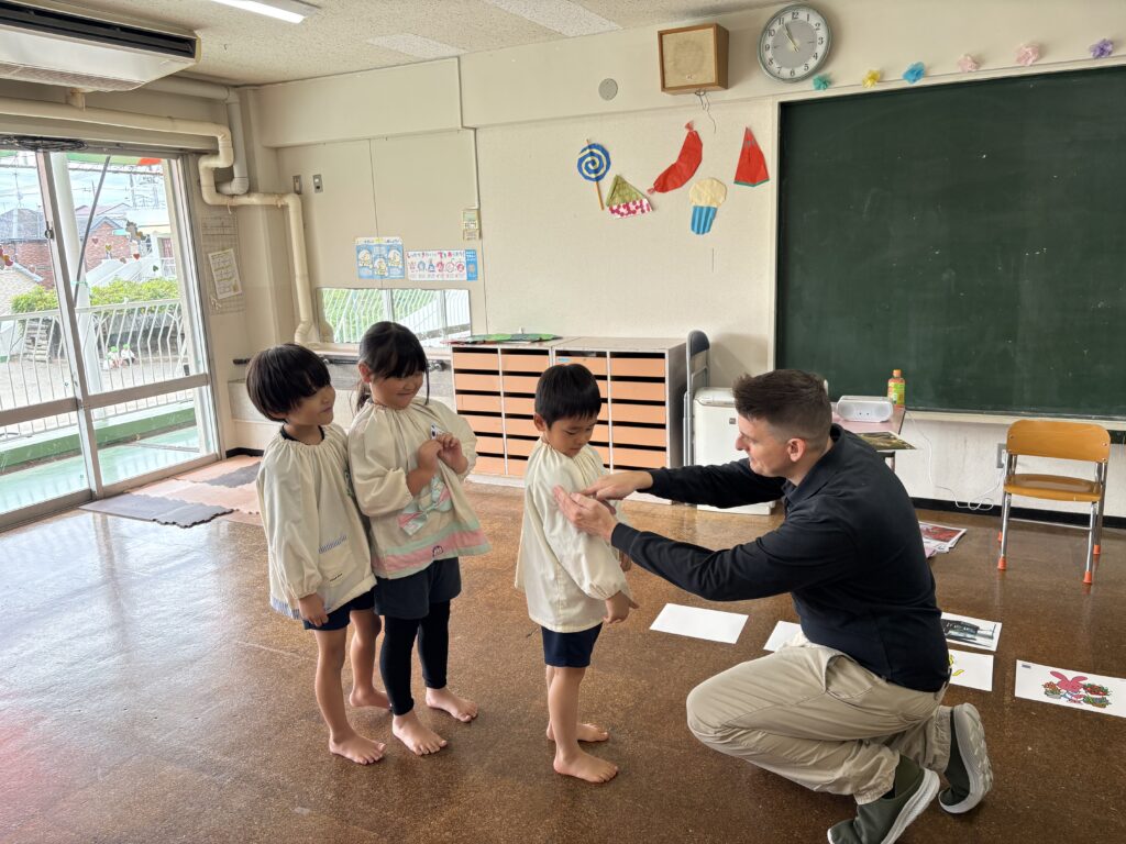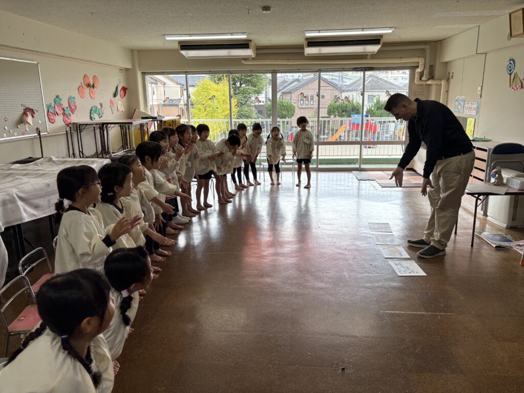 英語での挨拶も、講師の先生にジェスチャーをしながら元気よくできましたね。