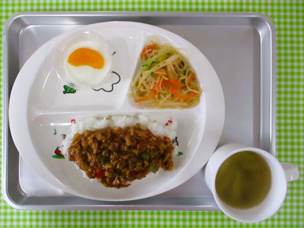 ジャージャー丼、白菜の中華スープ、中華風春雨サラダ、フルーツミルク寒天