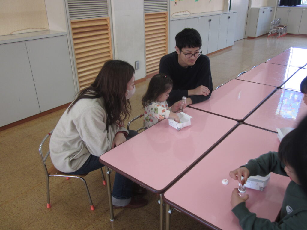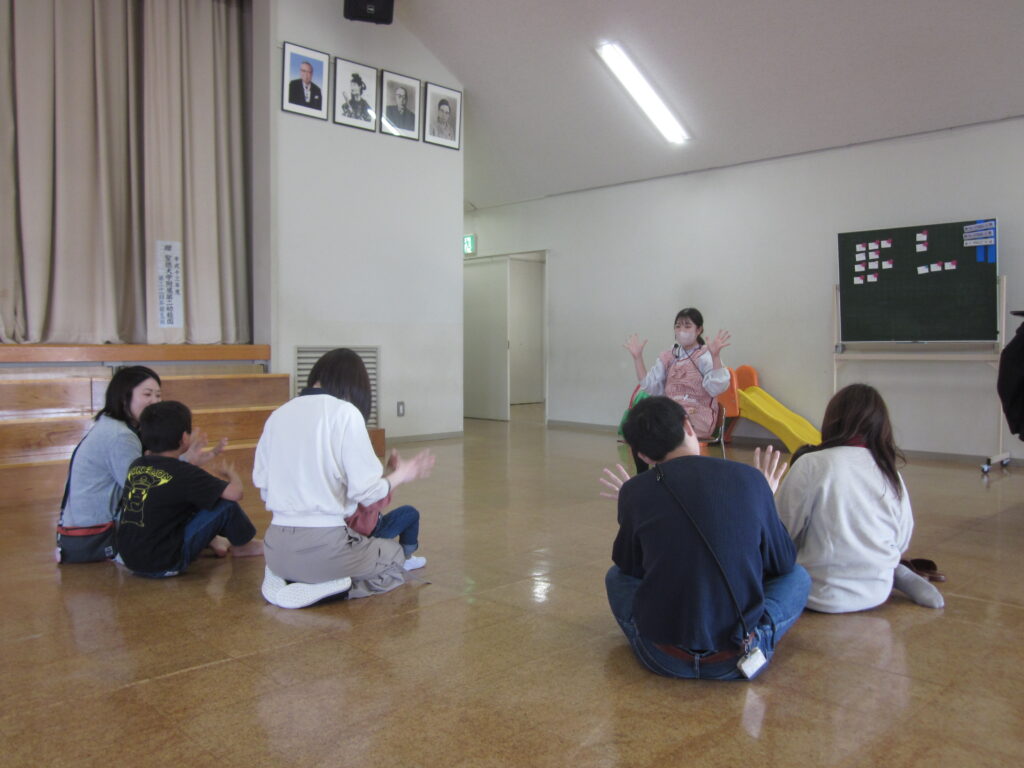 遊戯室に全員集まると、「むすんでひらいて」と「大きな栗の木の下で」の手遊びをして「おはようのうた」を歌いました。身体を使って楽しく歌うことができましたね。