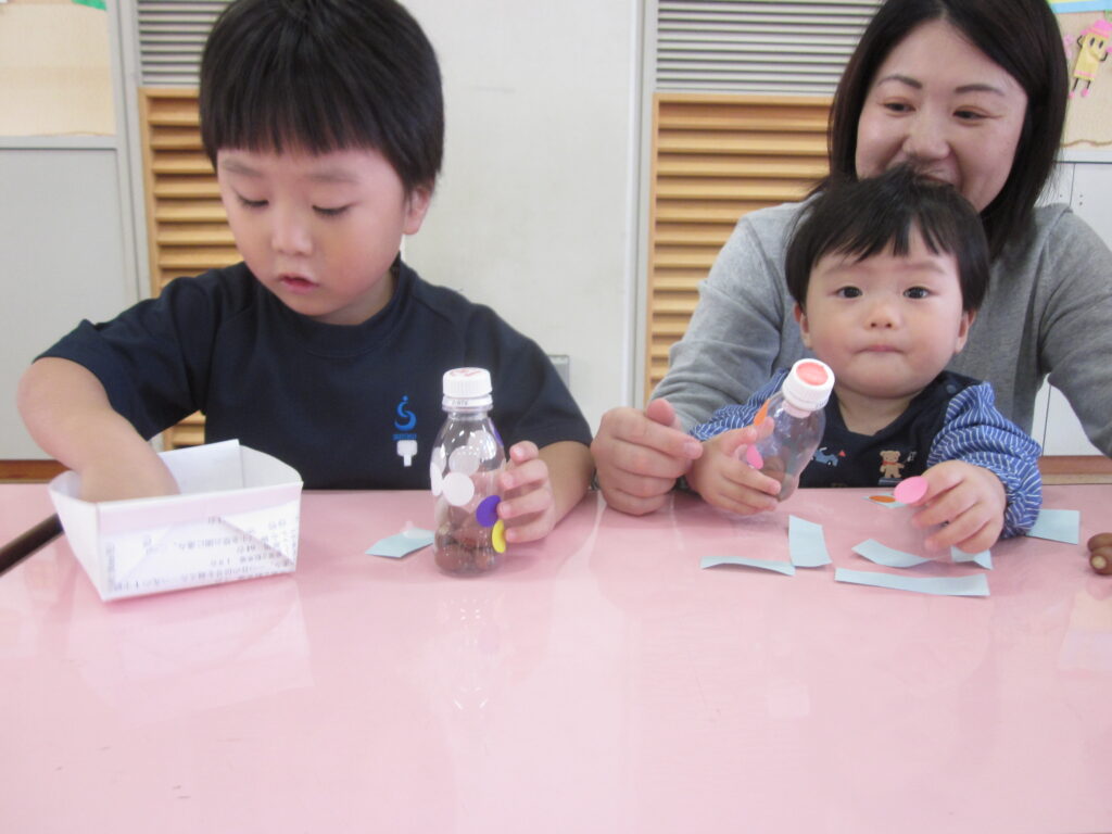 ミニペットボトルの容器にどんぐりを入れて、シールを貼って楽器『マラカス』の完成です。