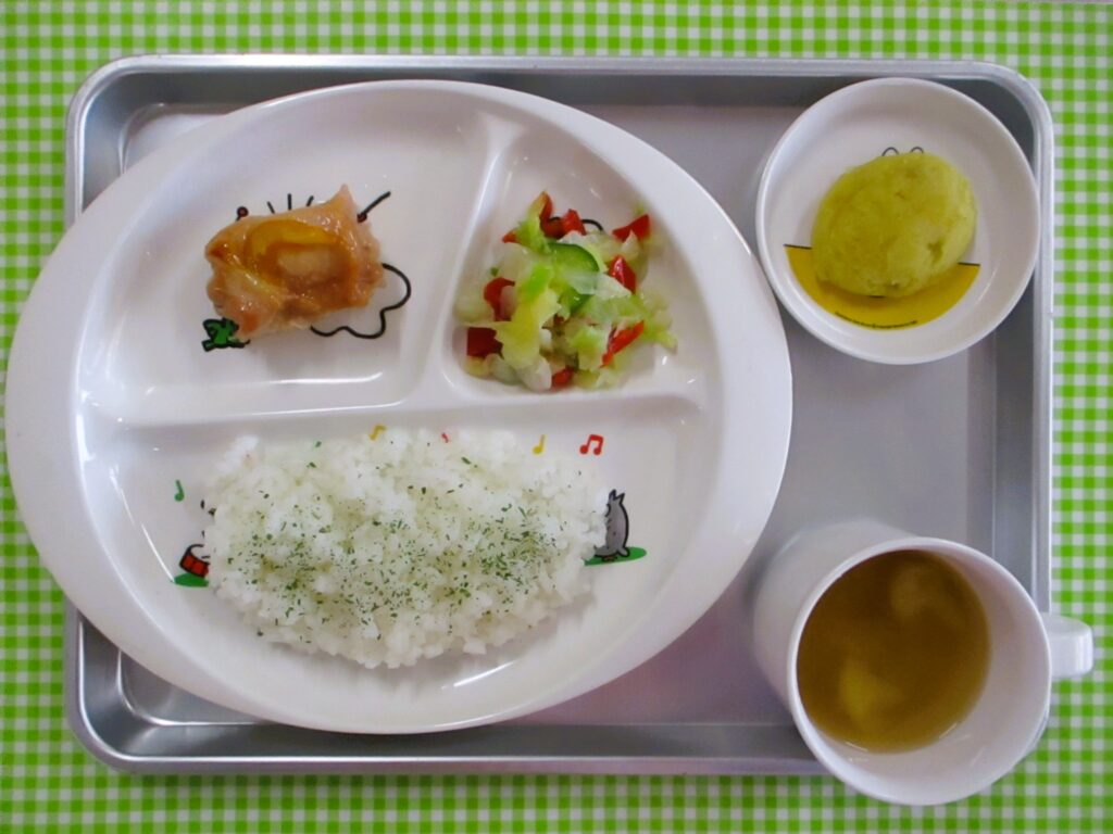 パセリライス、さつまいもの味噌汁、鶏肉のマーマレード焼き、キャベツとパプリカのマリネ、スイートポテト