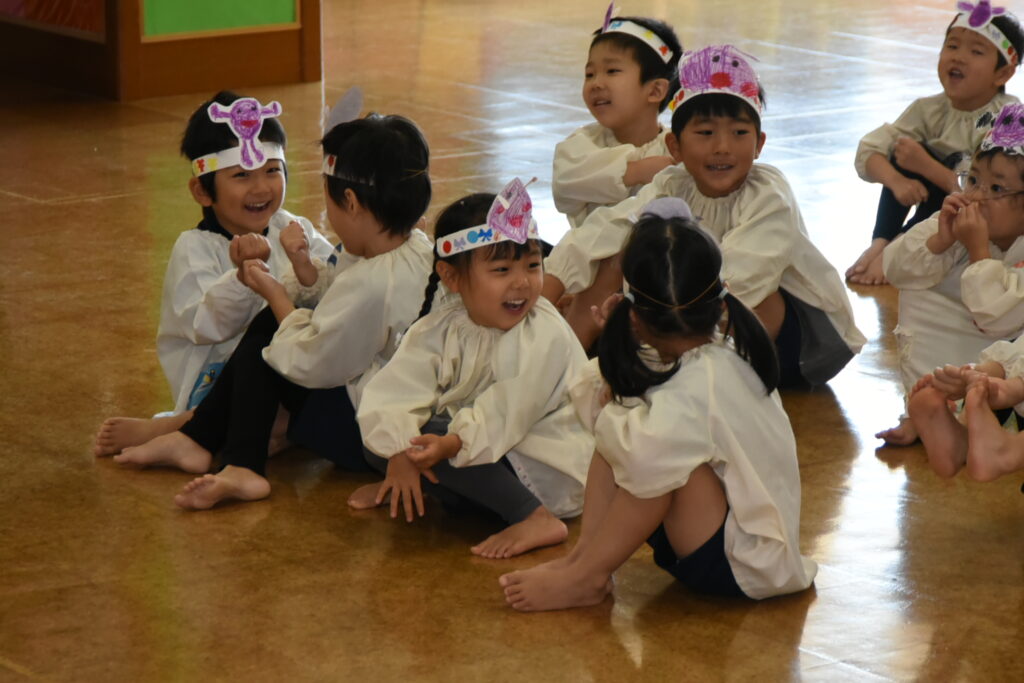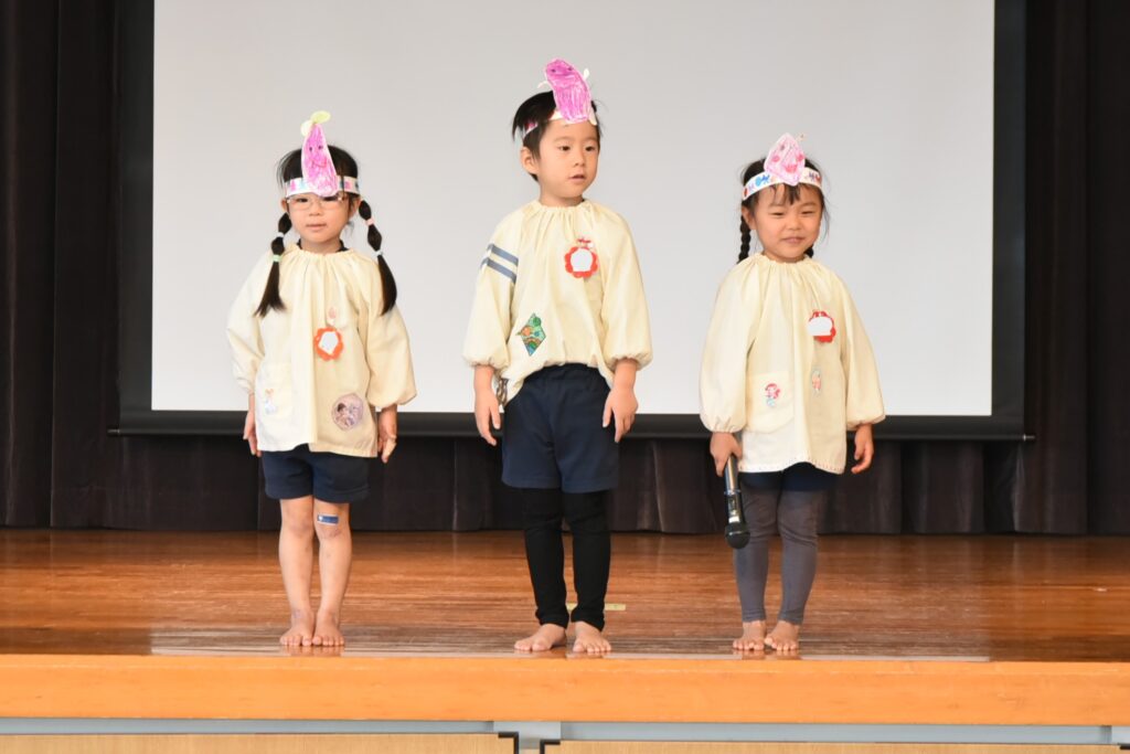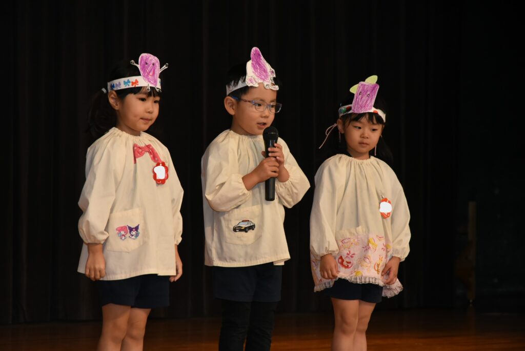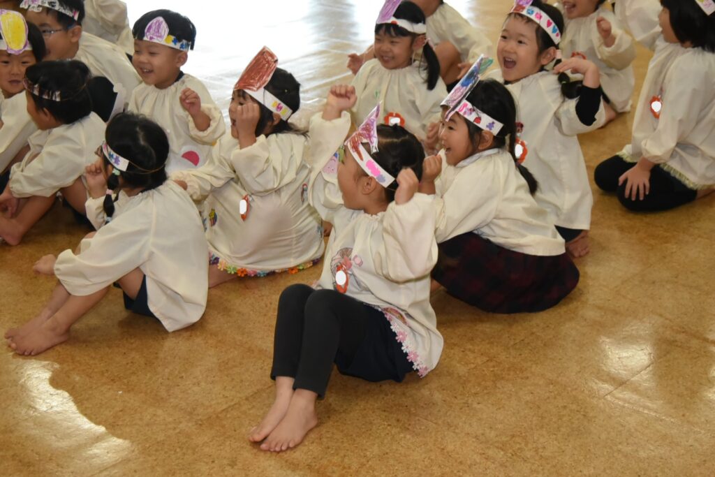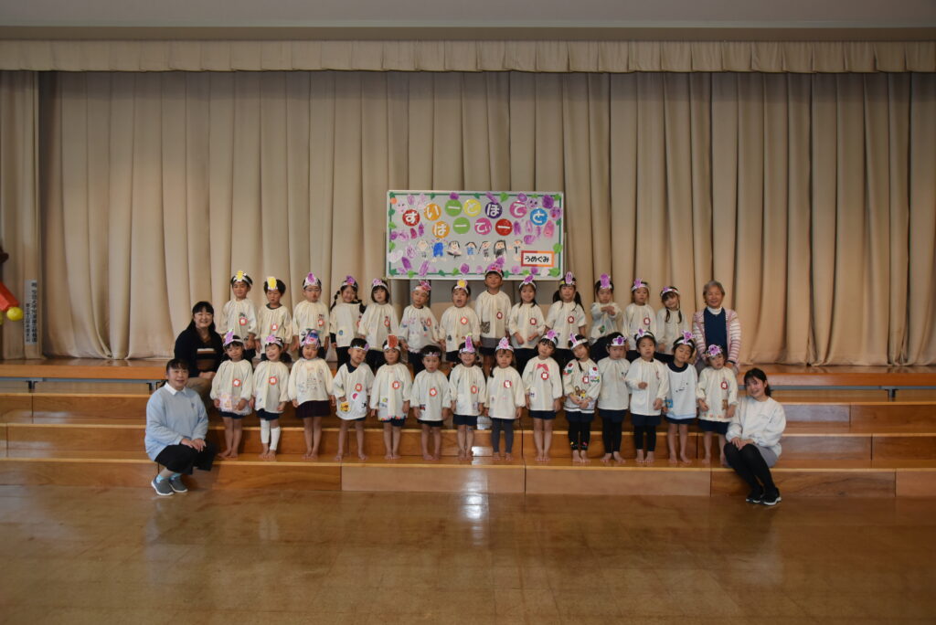 みんな笑顔で遊戯室に集まり、はじめの言葉で会が始まりました。