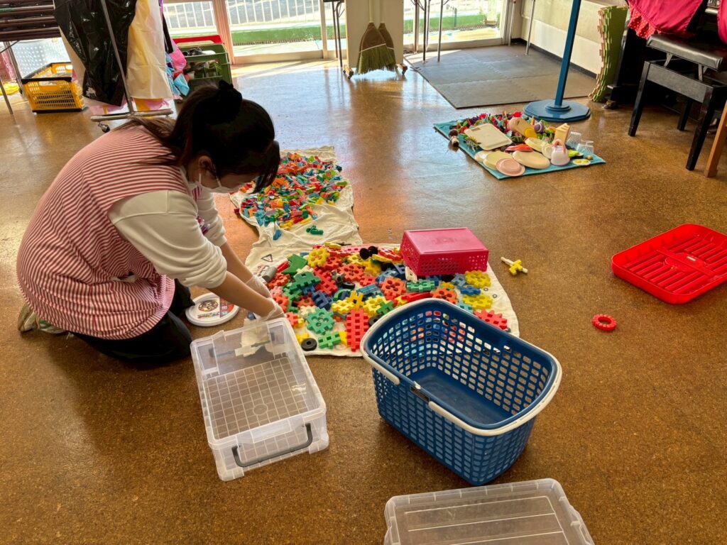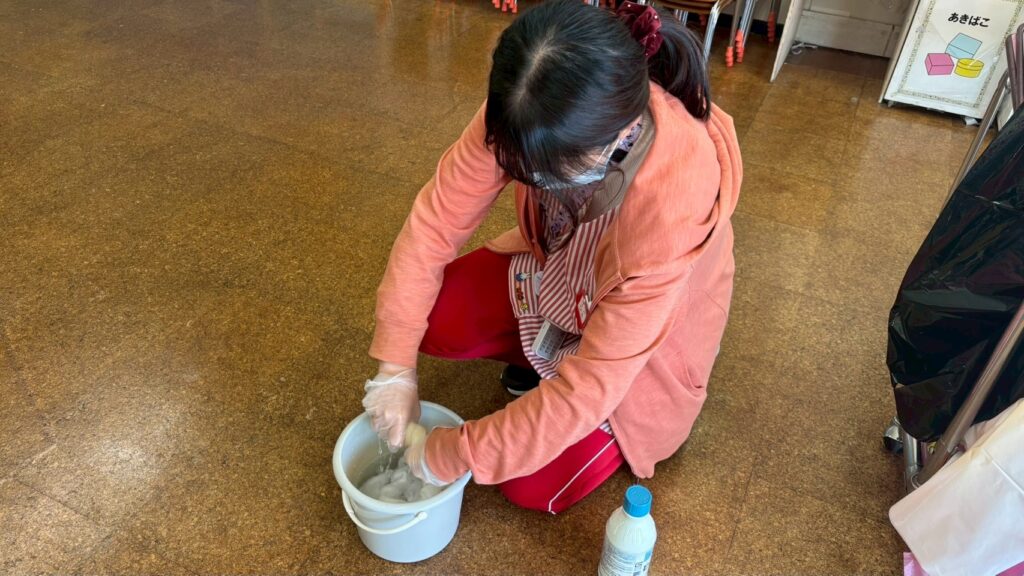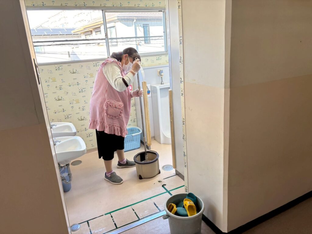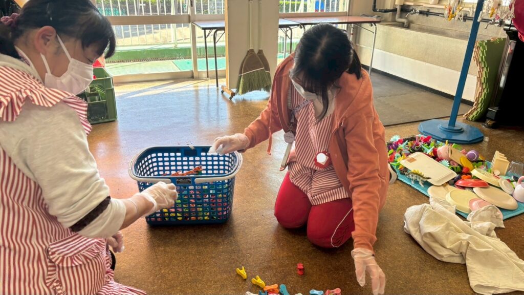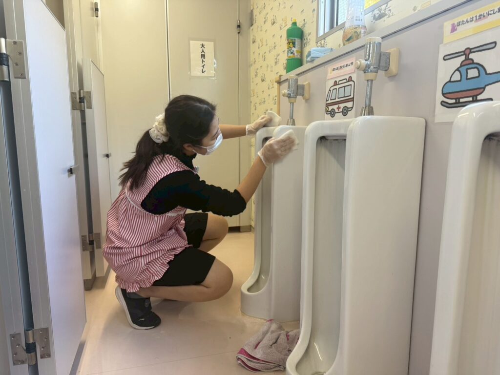 手すりや椅子、テーブルや水回り、トイレなど、園内の消毒です。