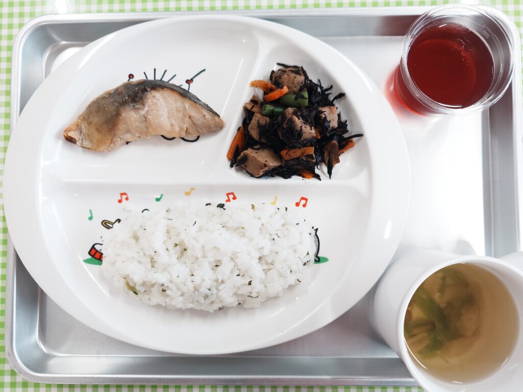 菜めし、絹さやのすまし汁、あじの梅味噌焼き、高野豆腐とひじきの煮物、ぶどうゼリー