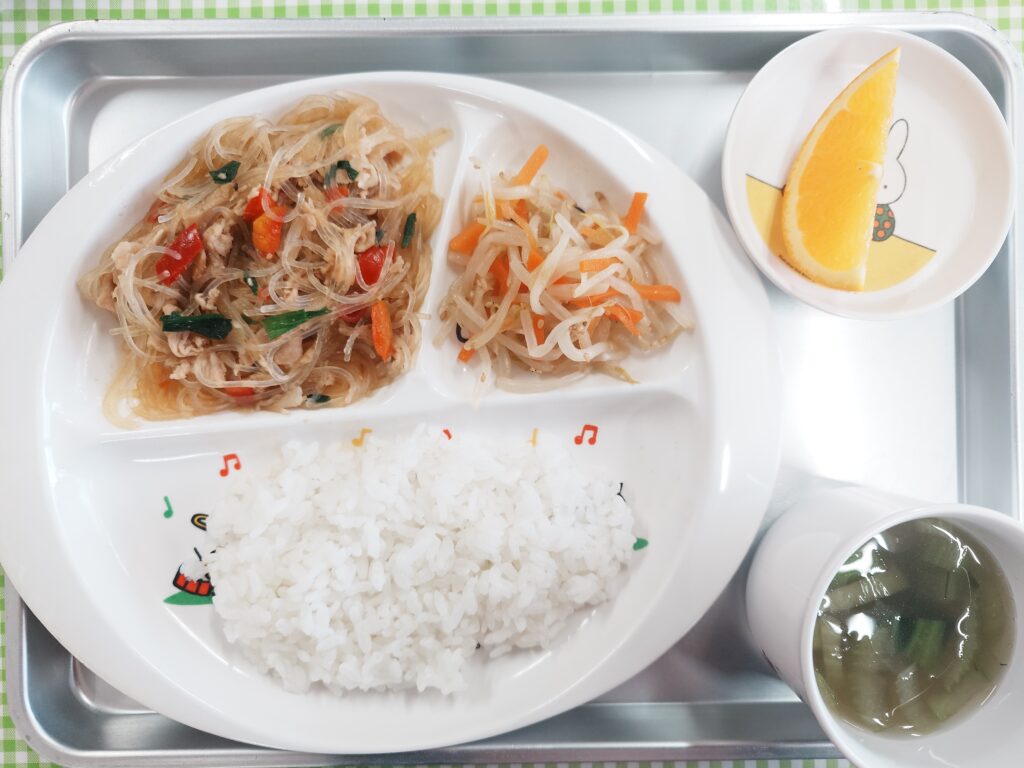 ごはん、ちんげん菜の中華スープ、チャプチェ、もやしのナムル、オレンジ