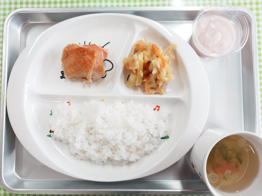 ごはん、ちんげん菜の中華スープ、揚げ鶏の甘酢ねぎソース、中華風わかめサラダ、ピーチヨーグルト