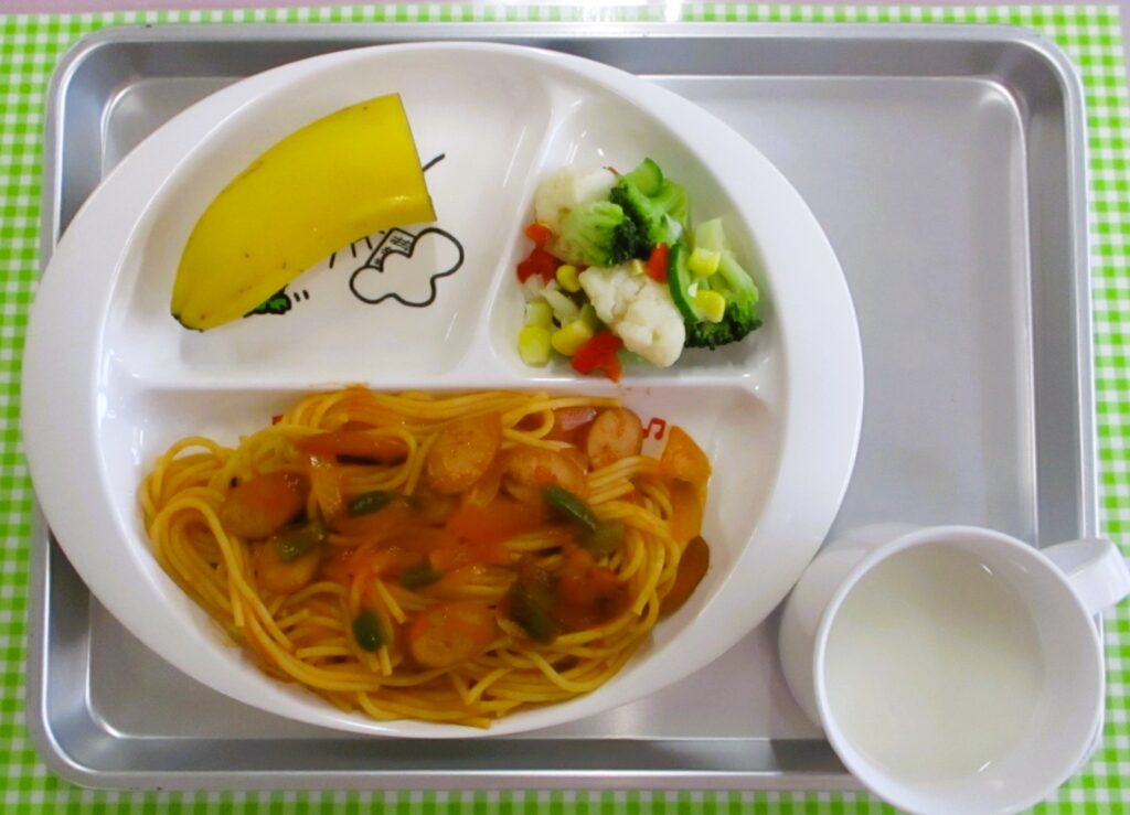 ナポリタンスパゲッティ、ポテトミルクスープ、花野菜サラダ、バナナ