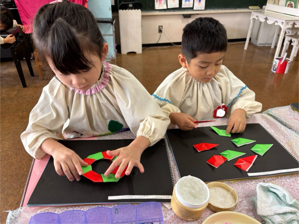 ハートを組み合わせてリボンやクローバーにして飾り付けているお友達もいましたよ。