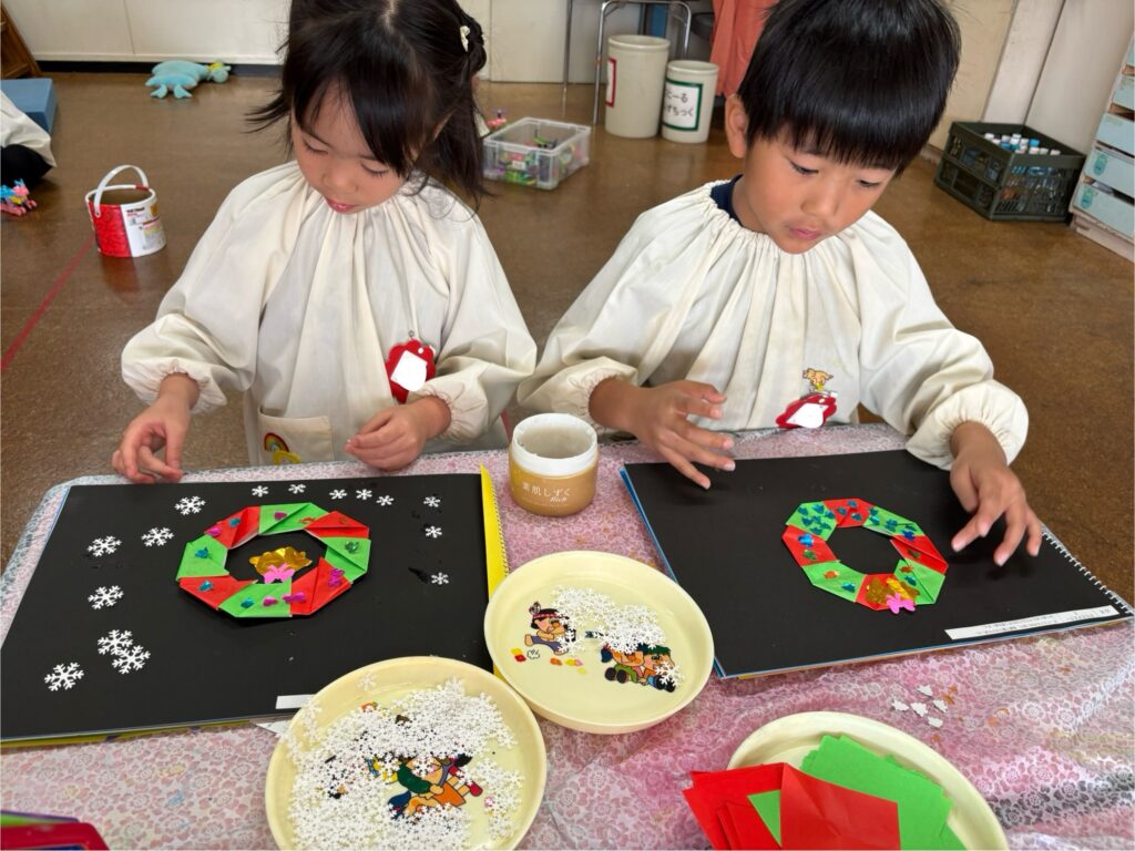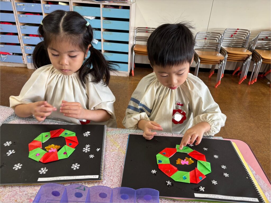 折り紙を三角に折り、形を整え、8枚繋げて、クリスマスリースを作りました。