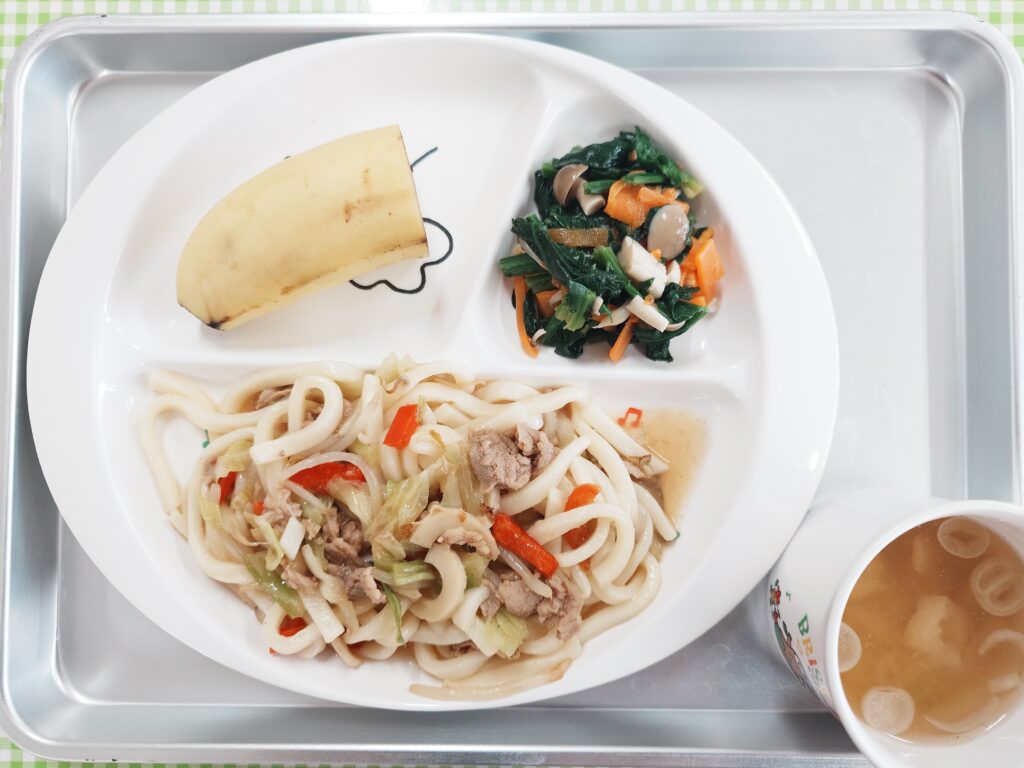 焼きうどん、さつま芋の味噌汁、ほうれん草の和風サラダ、バナナ