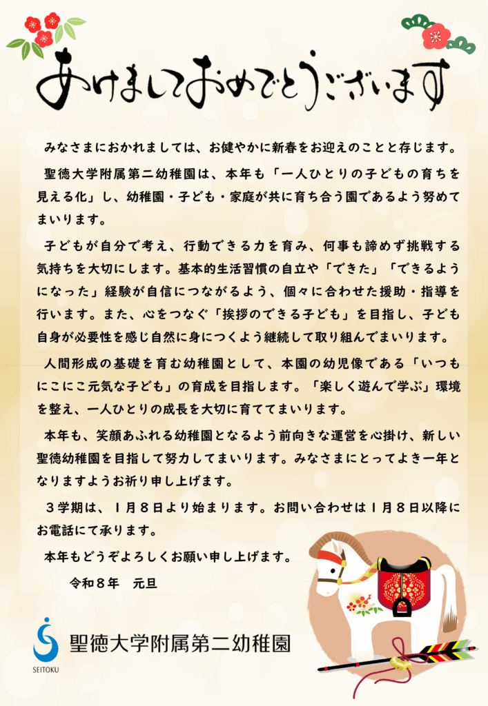 本園では、はがきによる年賀状でのご挨拶を差し控えております。誠に恐縮ではございますが、何卒ご理解のほどお願い申し上げます。引き続き変わらぬご厚情を賜りますよう、心よりお願い申し上げます。