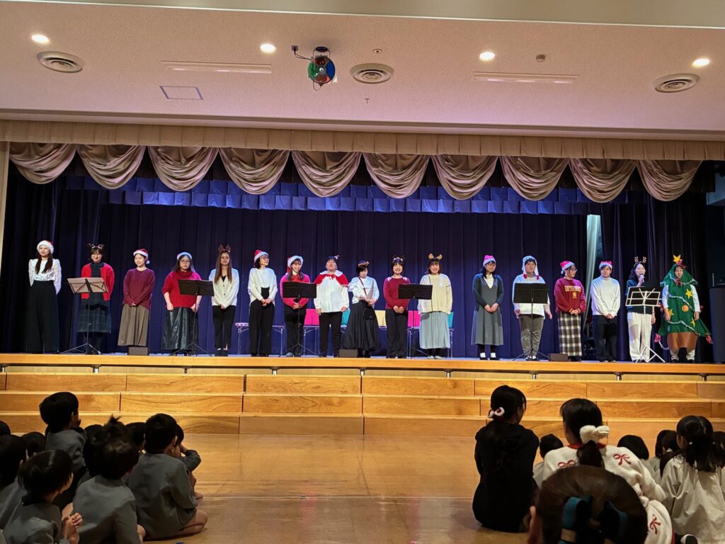 今回は、コーラス部のお母様方が『ママサンタ』になって、歌や合奏のプレゼント『クリスマスコンサート』が開催されました。