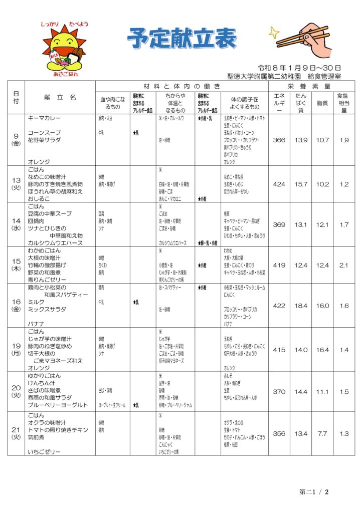 予定献立表(1/9~1/30)