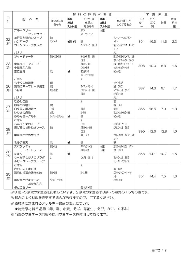 予定献立表(9/2~9/30)