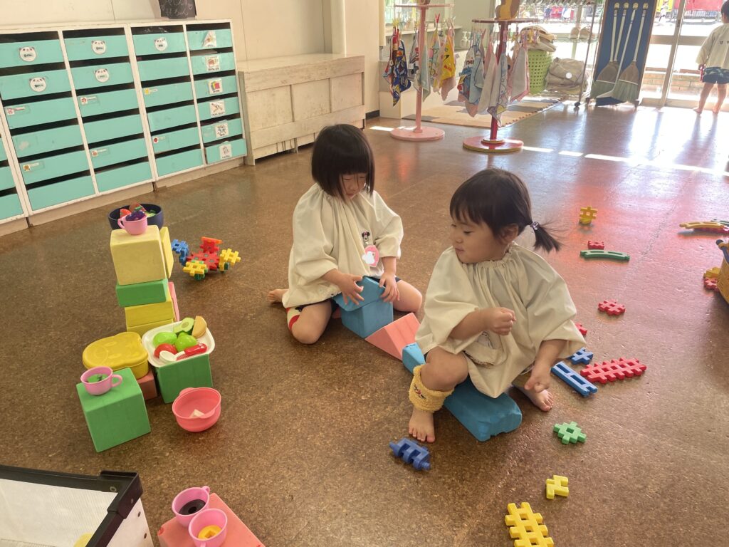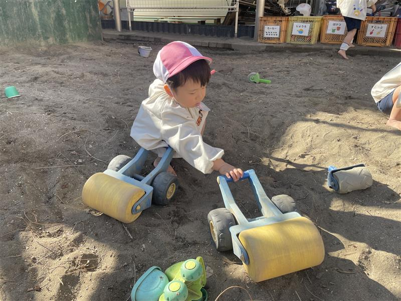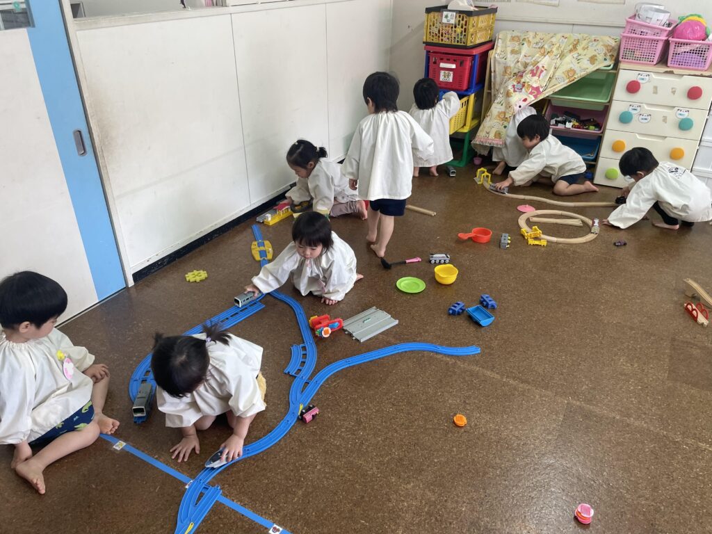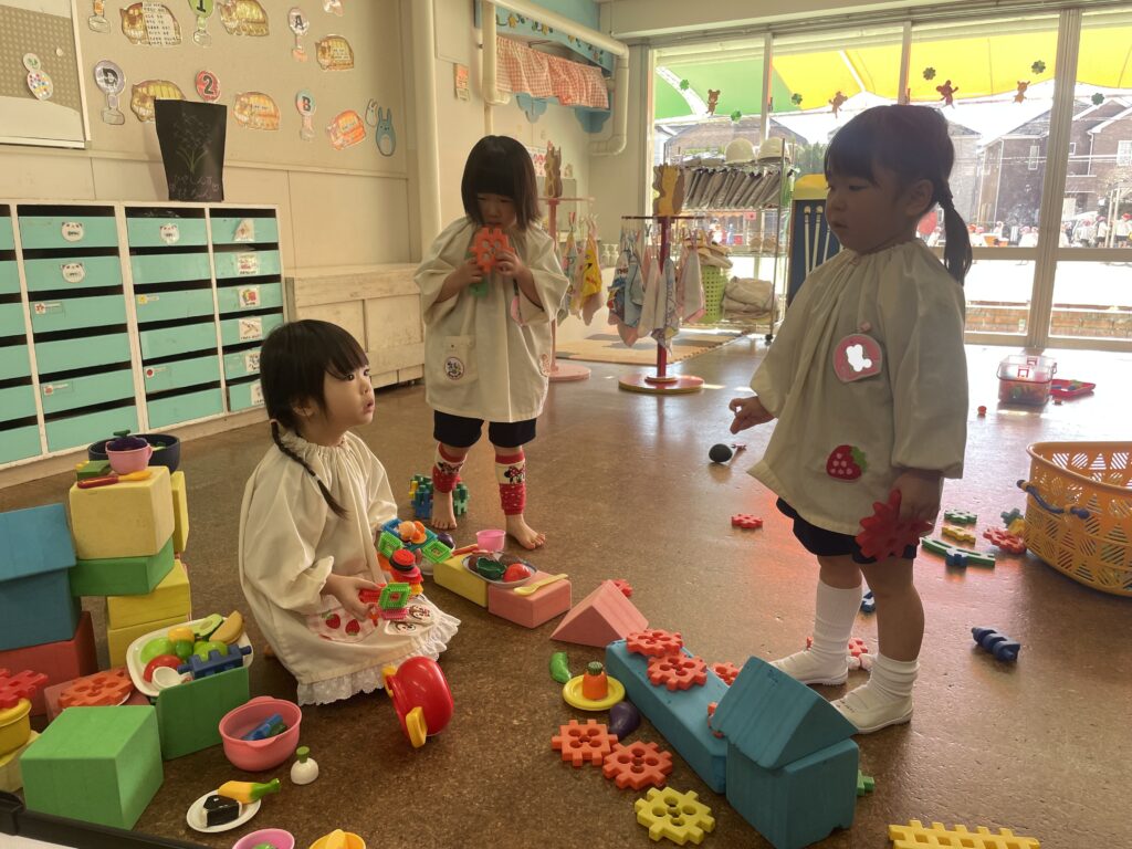 自由遊びでは、一人でいろいろ試しながら遊び夢中になる姿や、友達を見つけ声をかけ、一緒に遊ぶ姿も見られます。