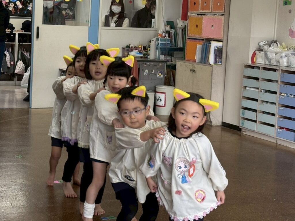 実際に被り物を被ってセリフを言うことでいつもよりも大きな声で言うことができていました。また、「ねこ役はこうやって踊った方がかっこいいよね」といつもよりも張り切って踊る姿が見られました。