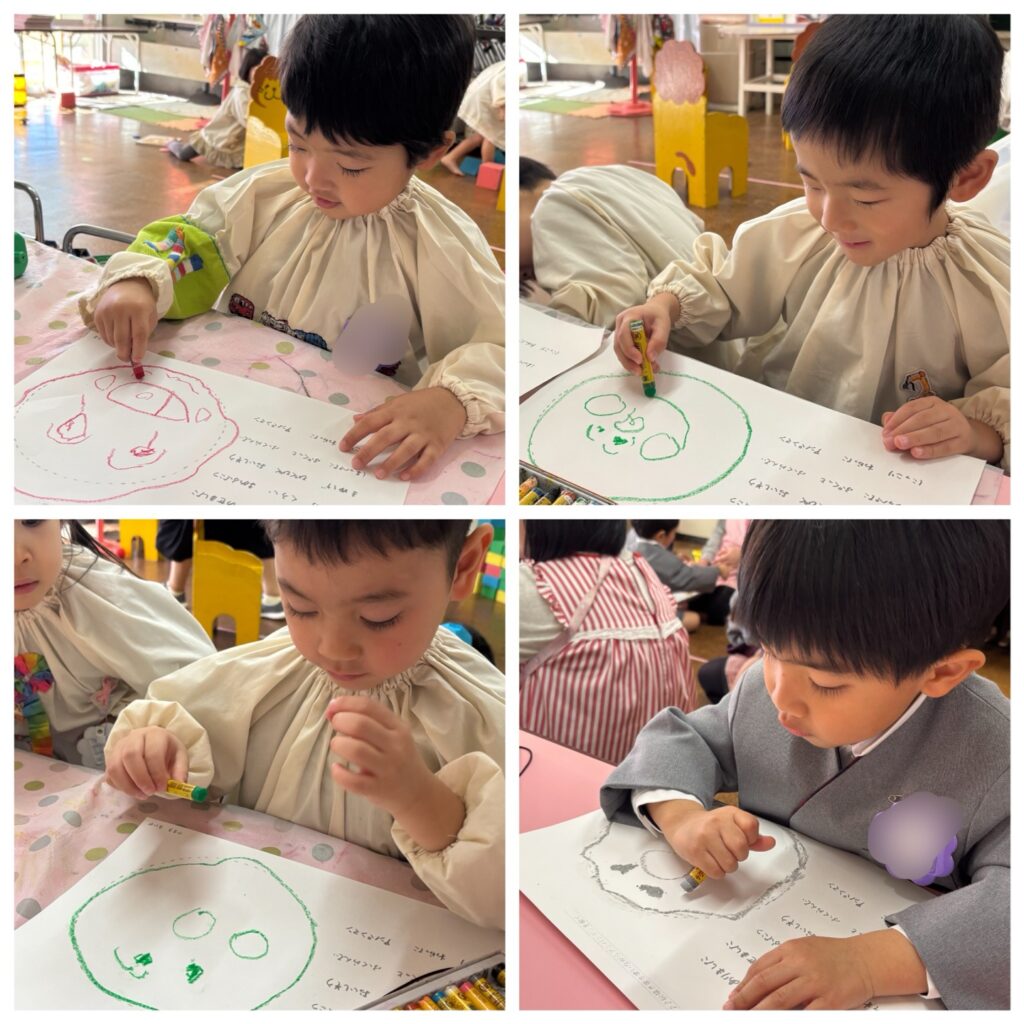 3歳児桜組は、『アンパンマンの絵描き歌』を歌いながら絵を描きました。