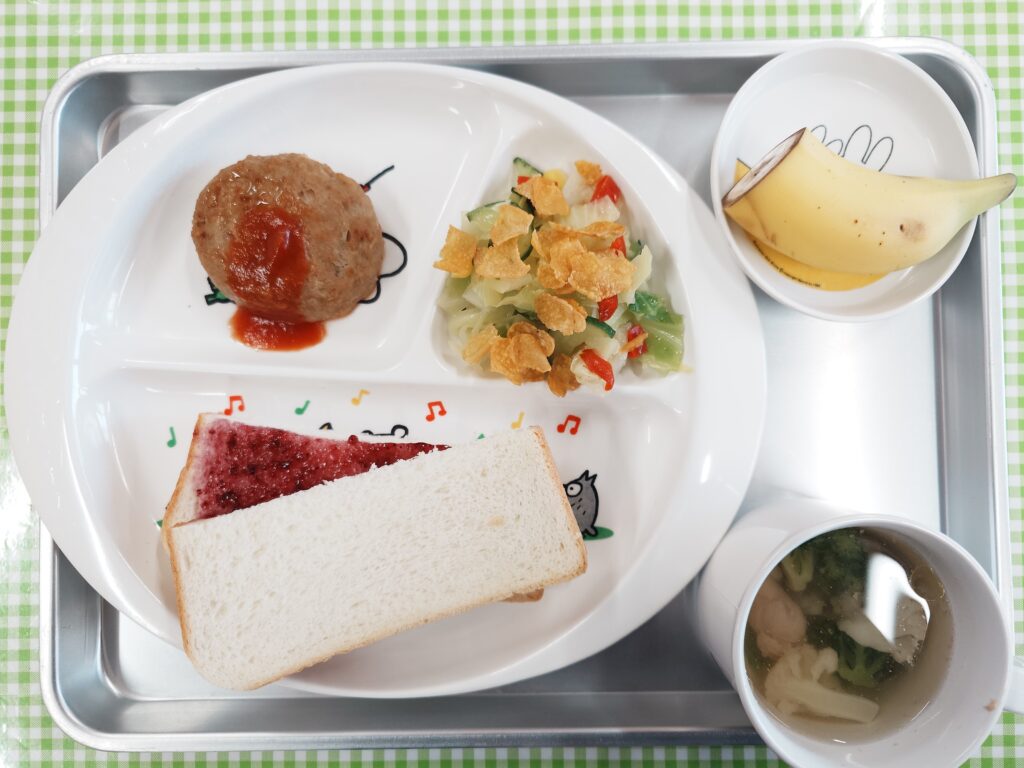 ブルーベリージャムサンド、花野菜と鶏肉のスープ、ハンバーグ、コーンフレークサラダ、バナナ