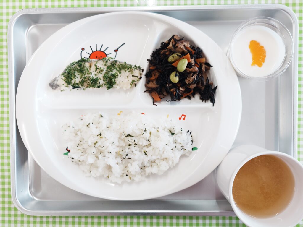 菜めし、白菜の味噌汁、白身魚の磯辺焼き、ひじきの煮物、みかんヨーグルト
