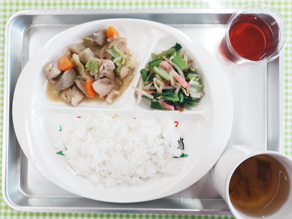 ごはん、ちんげん菜のスープ、揚げ鶏の甘酢ねぎソース、中華風わかめサラダ、ミルク寒天