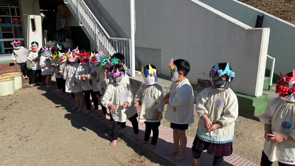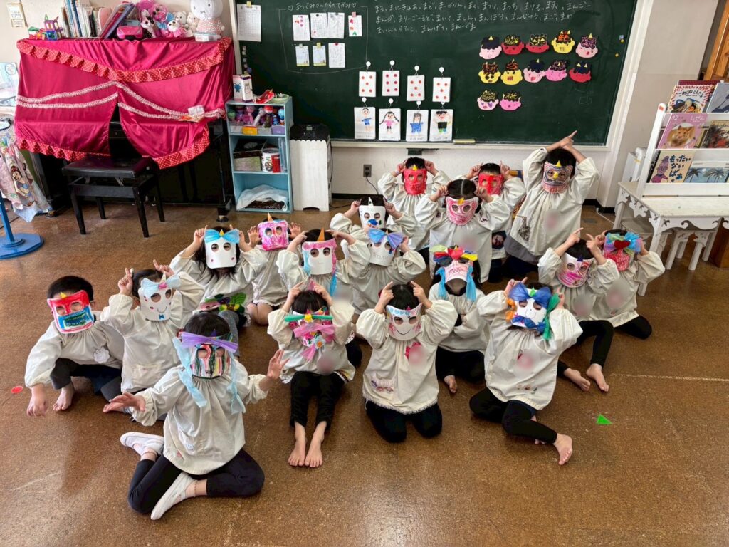 保育室に戻り、自分で作った鬼のお面を被って幼稚園の色々な場所にいる鬼を退治し、福の神が来るように豆まきをしました。