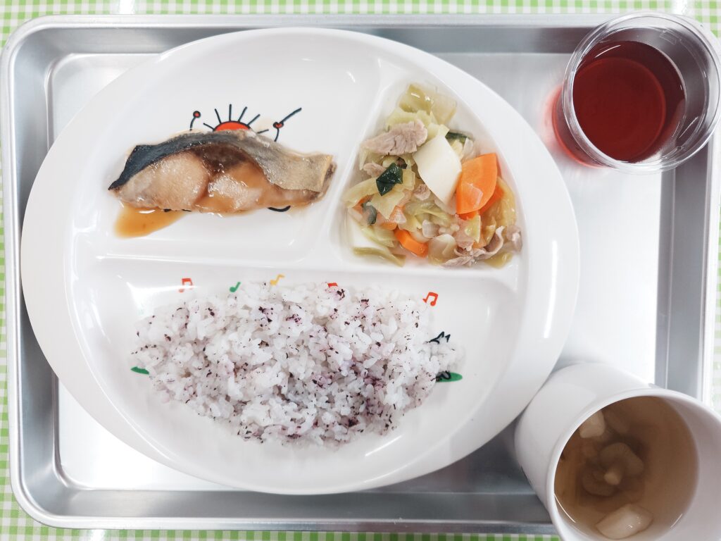 ゆかりご飯、きのこのすまし汁、あじのみりん焼き、野菜の和風煮、ぶどうゼリー