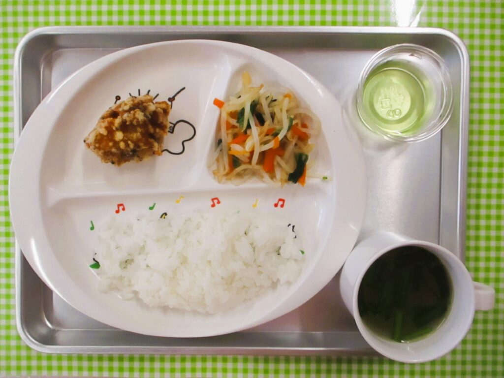 ごはん、ニラの中華スープ、鶏肉のごま揚げ、もやしの中華風和え物、青りんごゼリー