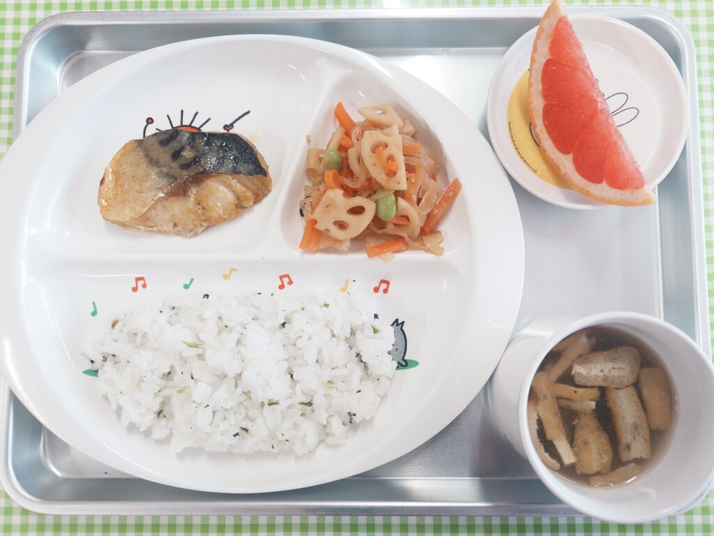 菜めし、ほうれん草の味噌汁、鯖のカレー焼き、れんこんのきんぴら、ルビーグレープフルーツ