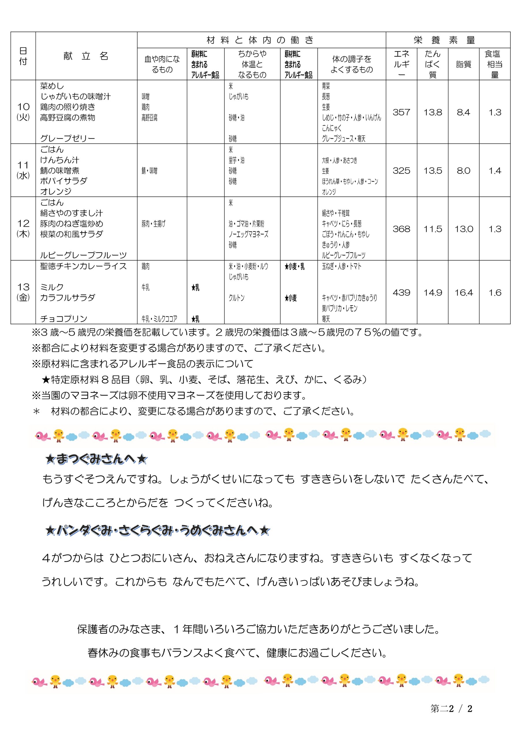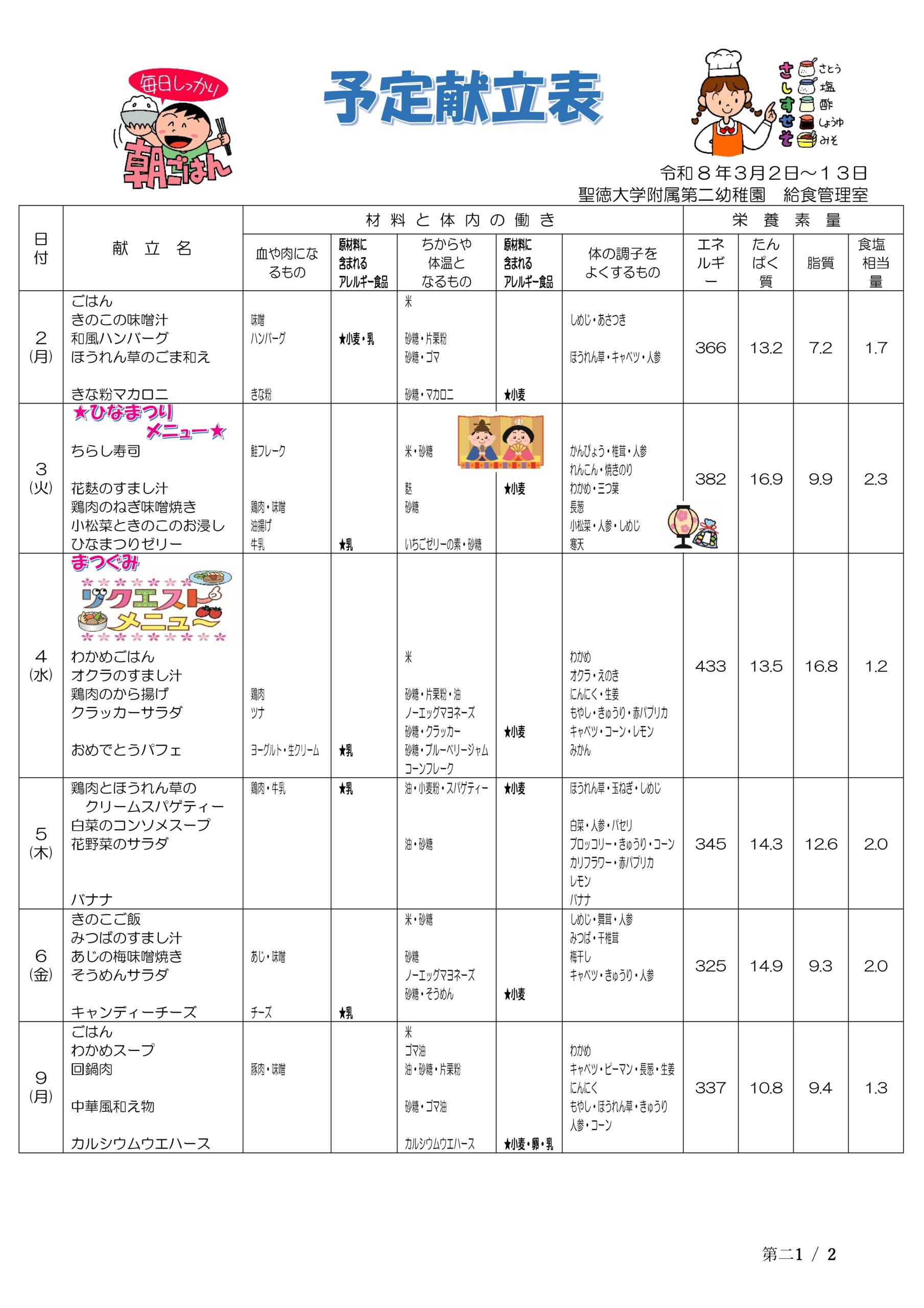 予定献立表(3/2~3/13)